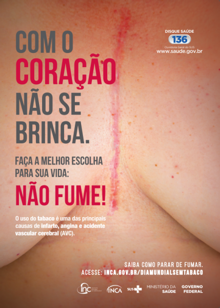 O tema escolhido pela Organização Mundial da Saúde (OMS) para o Dia Mundial sem Tabaco (31 de maio) foi tabaco e doenças cardiovasculares. Ele teve como objetivo aumentar a conscientização sobre a ligação entre tabaco e doenças do coração e outras doenças cardiovasculares (DCV), incluindo acidentes vasculares cerebrais, que, combinados, são as principais causas de morte do mundo. Cartaz produzido pelo INCA para o Dia Mundial Sem Tabaco 2018.