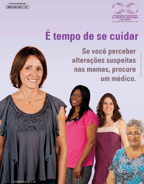 Cartaz da campanha É tempo de se cuidar - Diagnóstico Precoce. Se você perceber alterações suspeitas nas mamas, procure um médico
