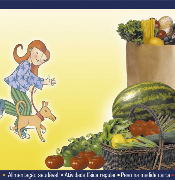 Folheto sobre alimentação saudável, atividade física regular e peso na medida certa produzido pela Coordenação de Prevenção e Controle do Câncer do INCA.