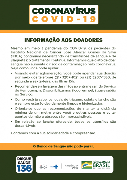 Mesmo em meio à pandemia do COVID-19, os pacientes do Instituto Nacional de Câncer José Alencar Gomes da Silva (INCA) continuam necessitando de transfusões de sangue e de plaquetas: o tratamento continua. Veja no folheto como você pode ajudar.