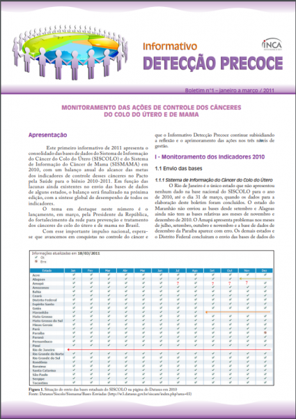 Esta edição apresenta o consolidado das bases de dados do Sistema de Informação do Câncer do Colo do Útero (SISCOLO) e do Sistema de Informação do Câncer de Mama (SISMAMA), em 2010, com um balanço anual do alcance das metas dos indicadores de controle desses cânceres no Pacto pela Saúde (biênio 2010-2011). Outras edições sobre o monitoramento das ações de controle dos cânceres de mama e do colo do útero podem ser acessadas em Publicações (Tipo de publicação: Informativo; assunto: Câncer de mama e Câncer do colo do útero; termo de busca: Informativo Detecção Precoce) (abre em outra janela).