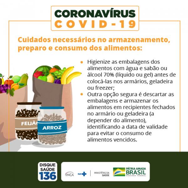 - Higienize as embalagens dos alimentos com água e sabão ou álcool 70% (líquido ou gel) antes de colocá-las nos armários, geladeira ou freezer;
