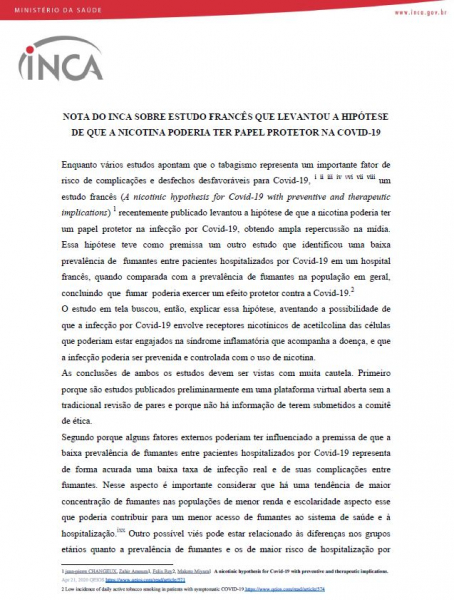 Nota do INCA sobre estudo francês que levantou a hipótese de que a nicotina poderia ter papel protetor na COVID-19